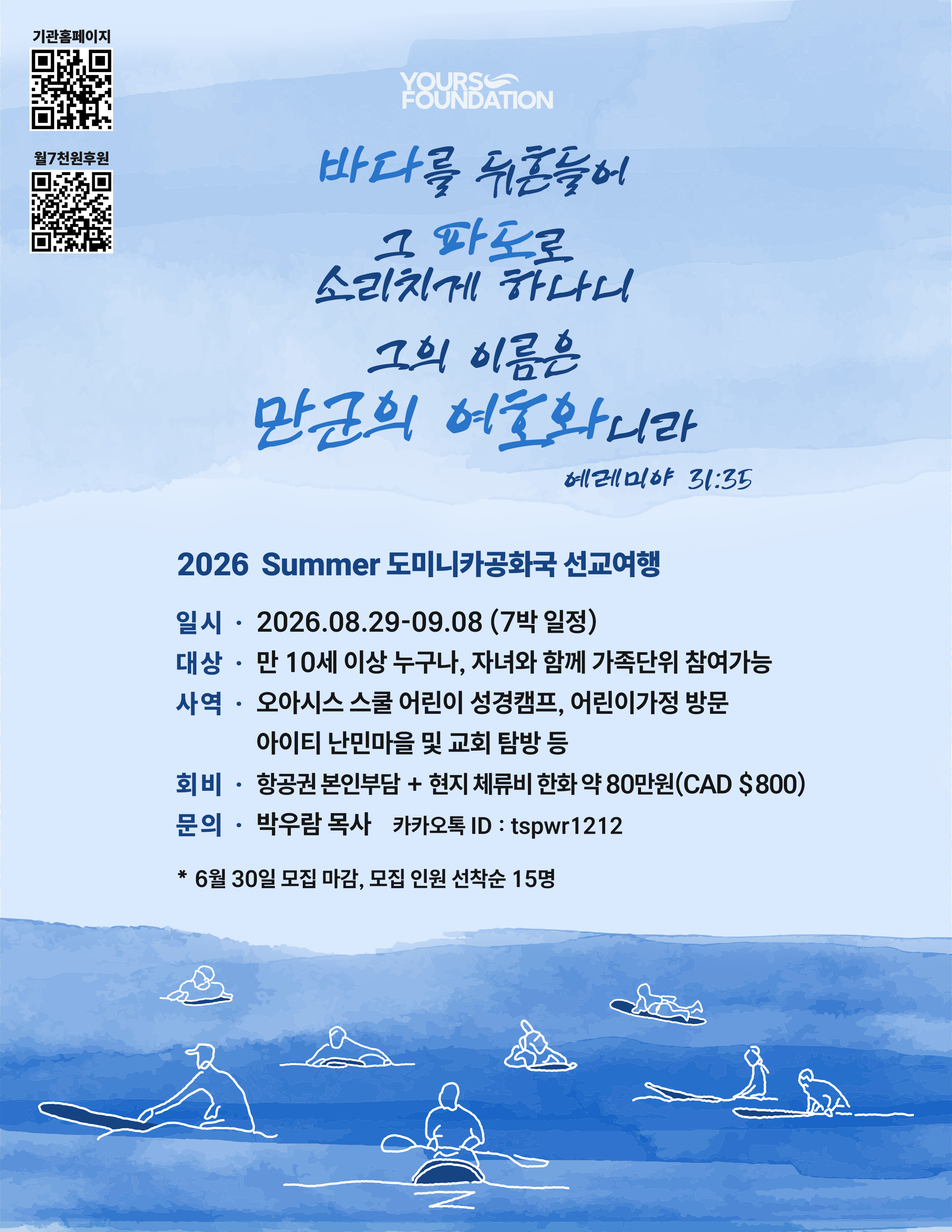 저희교회는 현재까지 총 10차 선교여행을 도미니카 공화국으로 다녀왔습니다. 계속해서 다음과 같은 일정으로 도미니카 공화국 선교여행이 예정되어있습니다. 함께 참여를 원하시는 분들은 박우람 목사에게 연락주세요.